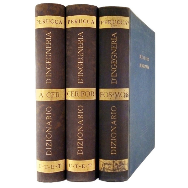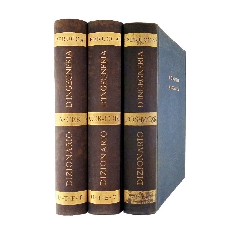 Eligio Perucca Dizionario D Ingegneria 3 volumi UTET 1952 Rilegati copertina rigida cartonata in tela blu con titoli in oro con numerose figure nel testo e tavole a colori Discrete condizioni segni di usura e del tempo alcune macchie di umidita
