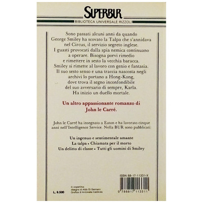 Un romanzo di spionaggio che segue il personaggio di George Smiley e il suo mondo di intrighi internazionali, dove le lealtà vengono messe alla prova e i segreti devono essere mantenuti a tutti i costi. Buone condizioni leggeri segni di usura Codice ISBN 8817113311