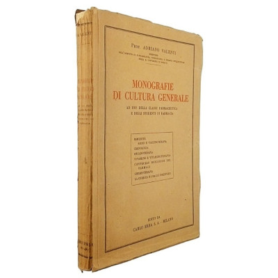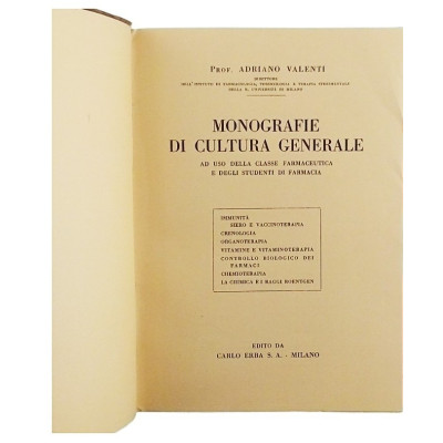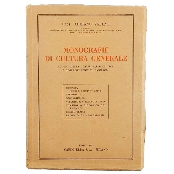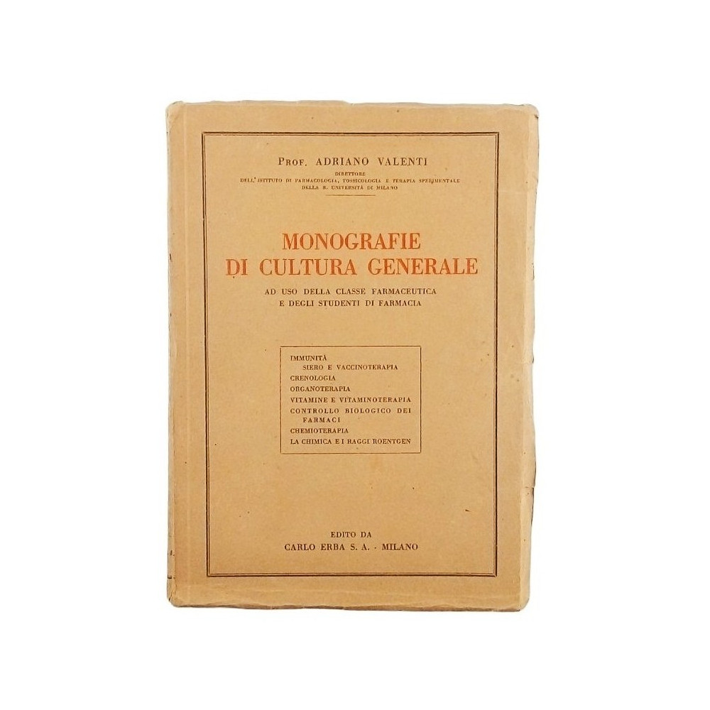 Prof Adriano Valenti Monografie di Cultura Generale Ad uso della classe Farmaceutica e degli Studenti di Farmacia Edito da Carlo Erba Rilegato copertina morbida in cartoncino pagine 204 Buone condizioni delle pagine leggermente ingiallite segni di usura e del tempo sulla copertina