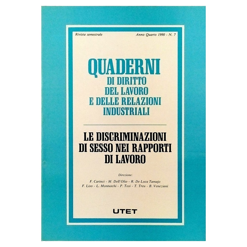 Rivista semestrale Quaderni di diritto del lavoro e delle Relazioni Industriali Anno Quarto 1990 n 7 UTET Le Discriminazioni di Sesso nei trasporti di Lavoro Copertina morbida in cartoncino illustrata pagine 232 Buone condizioni