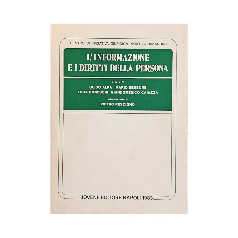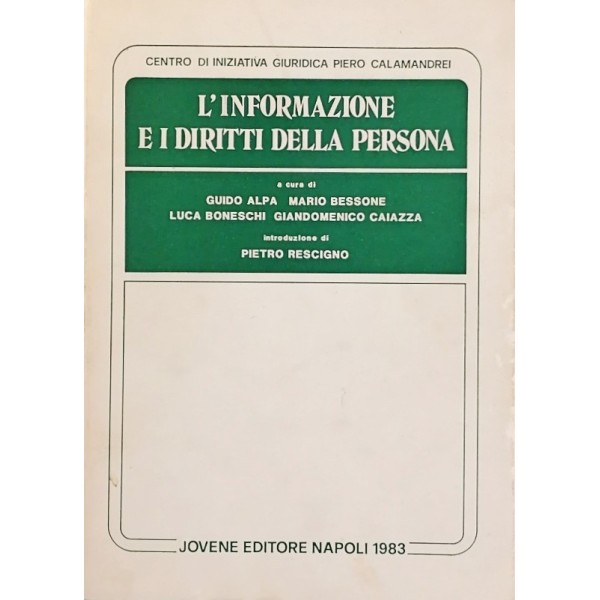 L'Informazione e i Diritti della Persona A cura di Guido Alpa - Mario Bessone - Luca Boneschi - Giandomenico Caiazza Introduzione di Pietro Rescigno Centro di Iniziativa Giuridica Piero Calamandrei Jovene Editore 1983 Copertina morbida in cartoncino pagine 348 Buone condizioni leggerissimi segni di usura e del tempo