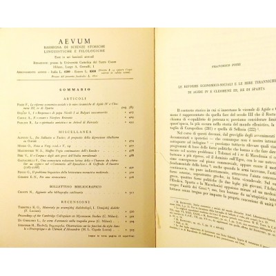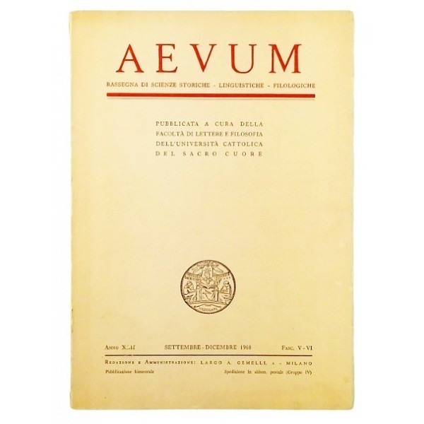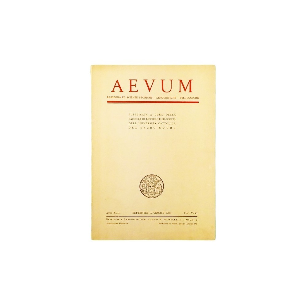 Rivista AEVUM Rassegna di Scienze Storiche Linguistiche Filologiche anno XLII settembre-dicembre 1968 Fascicoli V - VI Pubblicata a cura della Facolta di lettere e Filosofia dell Universita Cattolica Del Sacro Cuore Copertina morbida in cartoncino pagina da 384 a pagina 554 Discrete condizioni segni di usura e del tempo