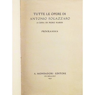 Tutte le opere di Antonio Fogazzaro a cura di Piero Nardi Arnoldo Mondadori Editore 1932 Copertina morbida in cartoncino pagine 89 con numerose foto in b/n e la riproduzione di diversi documenti Buone condizioni leggeri segni di usura